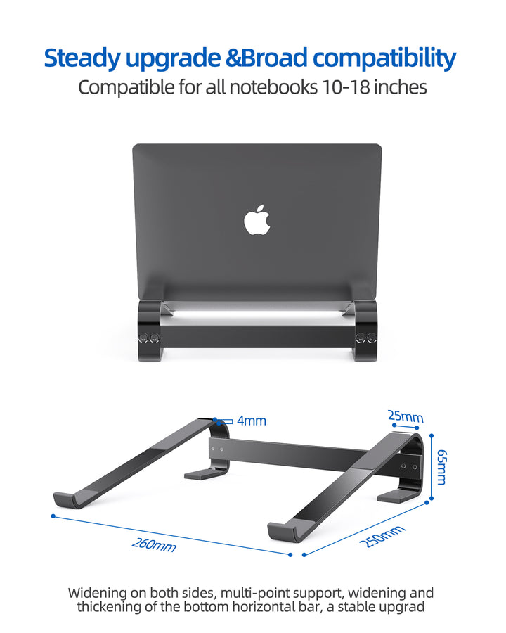 This laptop stand fits a wide range of laptops, accommodating sizes from 11" to 18". It is compatible with MacBook, MacBook Air, MacBook Pro, Surface Laptop, Dell XPS, Google Pixelbook, HP, ASUS, Lenovo, Acer, Chromebook, Alienware, and more. The widened sides, multi-point support, and reinforced bottom horizontal bar ensure stability and security.